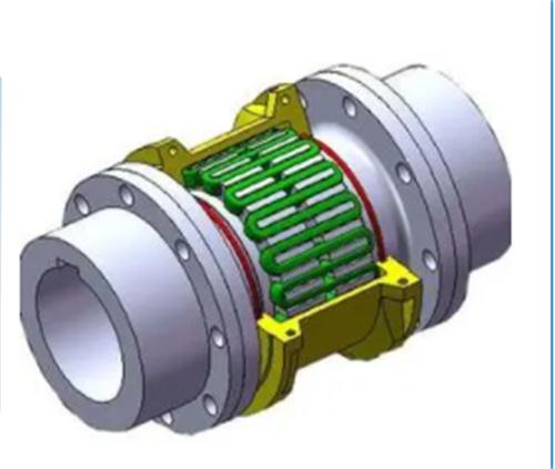 (2)撓性聯軸器:又分為齒套式和蛇形彈簧式兩種。齒套式聯軸器用套微的內齒分別與兩個齒輪嚙合,使兩個轉子聯接起來。它的優(yōu)點是有一定的活動性,可以消除和減弱振動的傳遞,對轉子中心要求不很高,不傳遞軸位移,但必須在運轉時通入潤滑劑,檢修和安裝要求質量高。蛇形彈簧管聯軸器是在兩個被連接的對輪的外緣銑出的類似漸開線的牙齒上,沿園周嵌入若干彈性剛帶制成的蛇形彈簧,把兩個對輪聯接起來。優(yōu)點是:能避免傳遞振動,又允許轉子有較大的中心偏差和軸向位移。但結構復雜、傳遞力矩小,運行中需要潤滑。